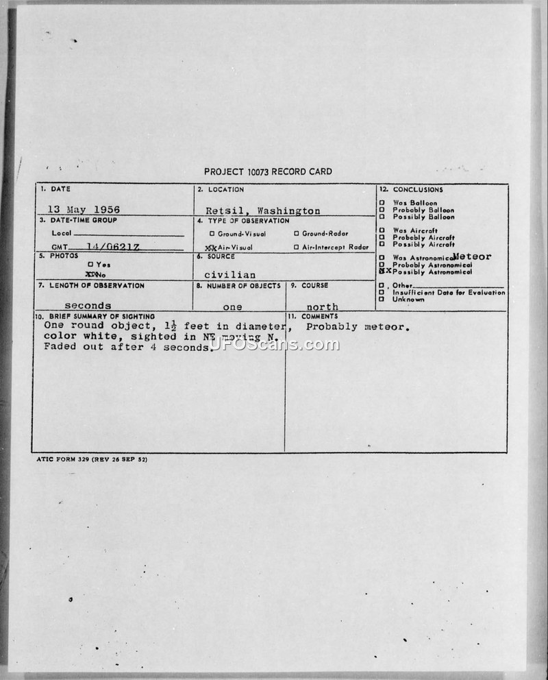 A civilian reported a round, white object in Retsil, Washington, on May 13, 1956. The military investigation concluded the object was likely a meteor.