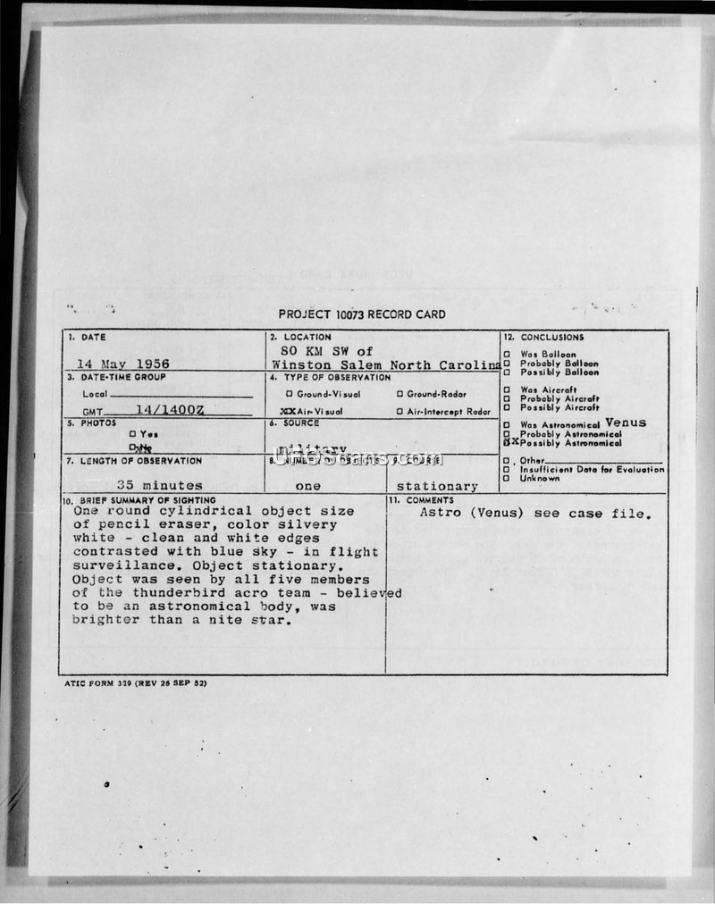 A 1956 Project 10073 record card documenting a 35-minute sighting of a stationary object by the Thunderbird aero team, which was officially identified as the planet Venus.