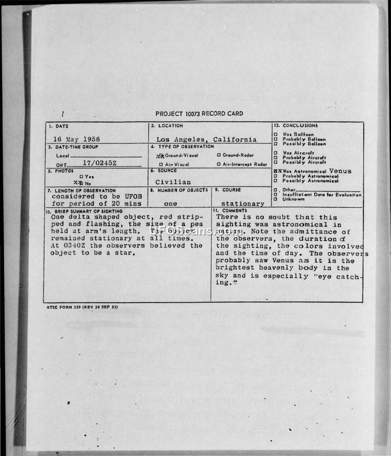 A 1956 sighting of a stationary, flashing, delta-shaped object in Los Angeles was investigated by the Air Technical Intelligence Center. The official conclusion identified the object as the planet Venus.