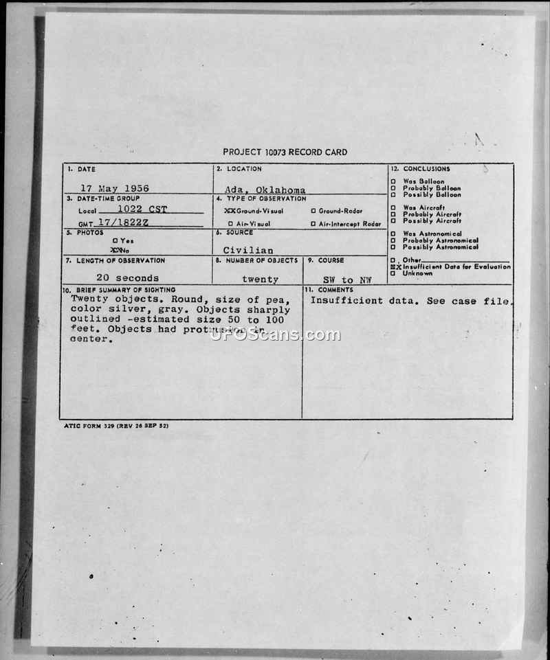 A 12-year-old witness reported 20 high-speed, disk-like objects over Ada, Oklahoma, in May 1956. The Air Force classified the report as having insufficient data and expressed doubt regarding the witness's credibility.