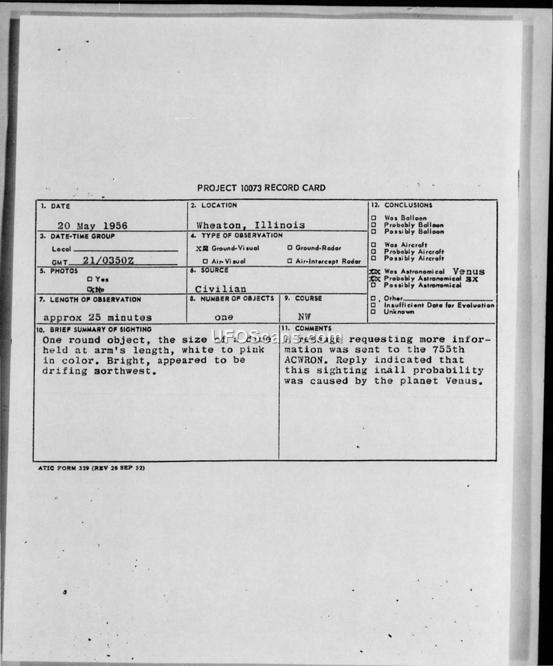 A civilian sighting of a bright, round object in Wheaton, Illinois, on May 20, 1956, was investigated by the 755th ACWRON. The military concluded the object was the planet Venus.