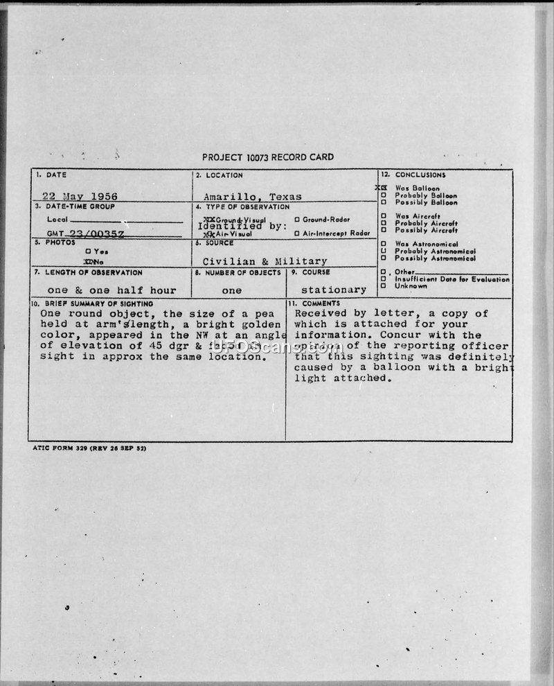 A 1956 sighting report from Amarillo, Texas, describes a stationary, golden, round object observed for 90 minutes. The military investigation concluded the object was a weather balloon with a bright light attached, based on pilot testimony and flight path correlation.