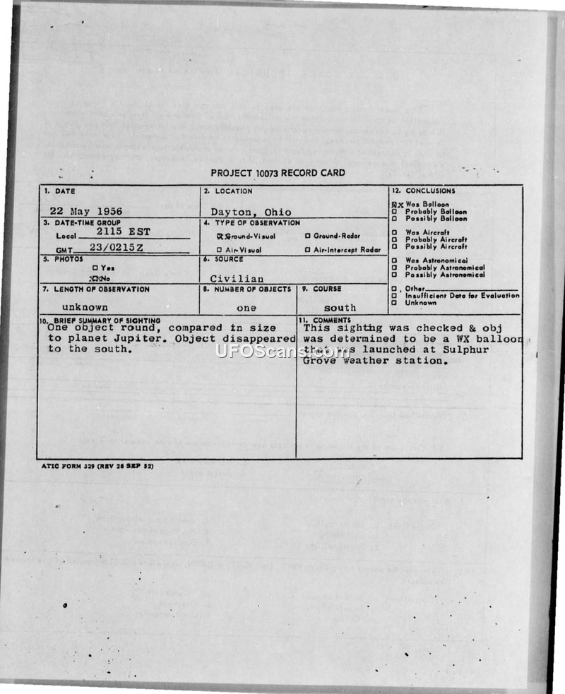 This document is a collection of Project 10073 record cards and U.S. Air Force Technical Information Sheets documenting various unidentified aerial phenomena sightings reported in May 1956. The records focus on two specific incidents in Dayton, Ohio, as well as several other reports from across the United States and Canada. On 22 May 1956, a round object compared in size to Jupiter was observed in Dayton; it was later determined to be a weather balloon launched from the Sulphur Grove weather station. On 31 May 1956, a high school student in Dayton reported a bluish, tear-drop-shaped object with a short tail, which was estimated to be ten feet long and observed for five seconds. This object was officially concluded to be a meteor. The document also includes press clippings and correspondence regarding other sightings, such as a report from Jacksonville, Florida, involving a bus passenger, and various accounts from California and Utah. These reports highlight the diverse nature of UAP sightings during this period, ranging from identified weather balloons and meteors to anecdotal accounts of brilliant, fast-moving objects. The Air Force utilized standardized questionnaires to gather detailed information from witnesses, including time, location, weather conditions, and physical characteristics of the objects, to facilitate their evaluation process.