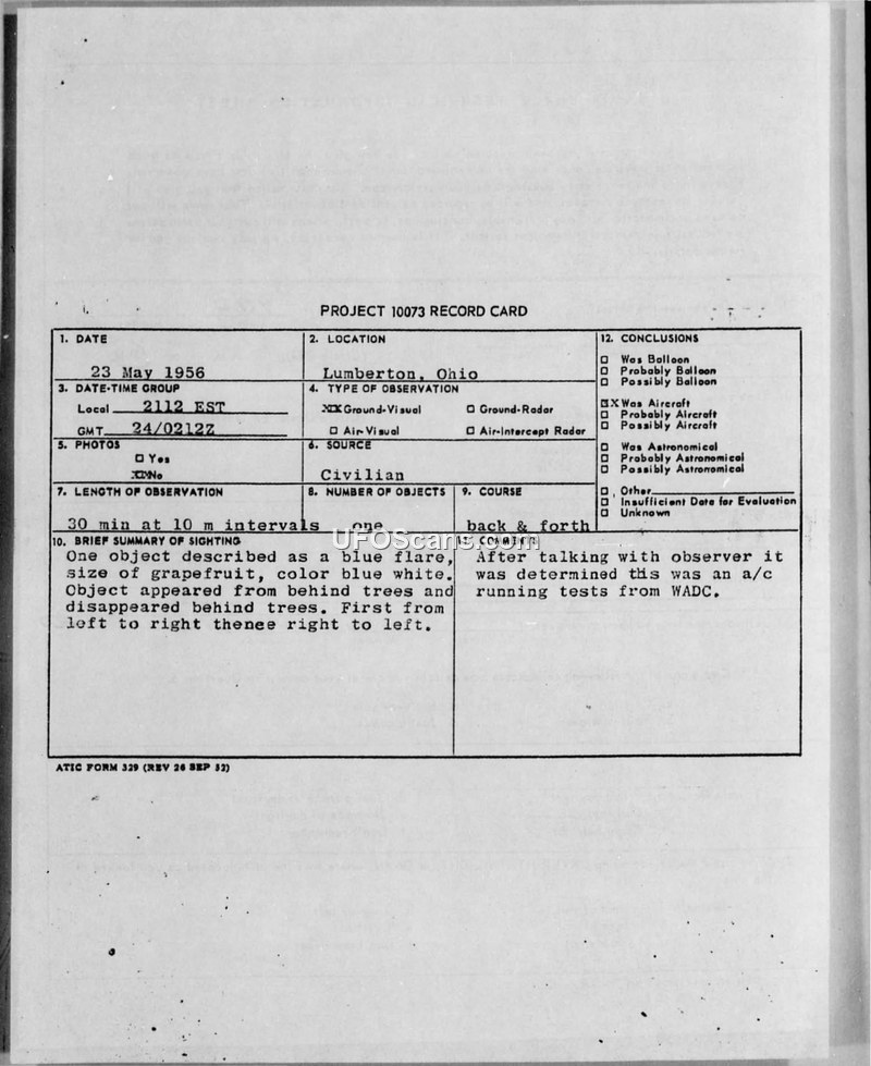 Project 10073 Record Card — Lumberton, Ohio, 23 May 1956