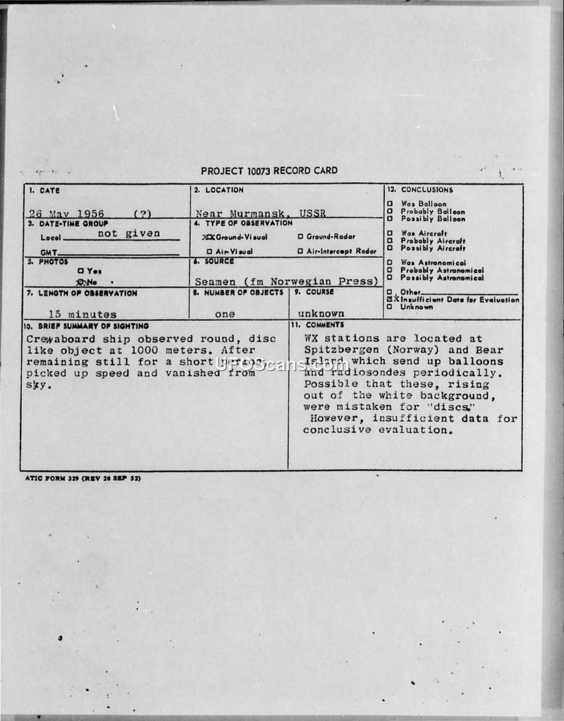 A ship's crew reported a disc-like object near Murmansk, USSR, on May 26, 1956. Intelligence officials suggested it may have been a weather balloon, but concluded there was insufficient data for a definitive explanation.