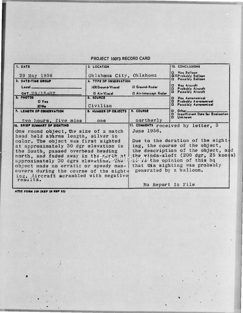 This document contains two distinct reports regarding unidentified aerial phenomena. The first is a Project 10073 record card documenting a sighting on May 29, 1956, in Oklahoma City, Oklahoma. A civilian witness observed a single, silver, round object for two hours and five minutes. The object was described as being the size of a match head held at arm's length, moving from the south to the north at approximately 30 degrees elevation. Military aircraft were scrambled to investigate, but the results were negative. The official conclusion of the headquarters was that the sighting was likely caused by a balloon, citing the duration, course, and winds-aloft data (200 degrees, 25 knots). The second part of the document consists of Intelligence Report IR-136-56, which details a sighting reported by the crew of a ship near the Russian coast between Murmansk and Teriberka in the White Sea. According to a newspaper report from Troms dated May 26, 1956, the crew observed a 'flying saucer' that performed various maneuvers over the ship. The object was estimated to be twice the size of an average commercial airliner and was described as moving with incredible speed, appearing like a 'streak of lightning.' The crew noted that the object remained stationary for a time at an altitude of approximately 1,000 meters before disappearing. The Norwegian Intelligence Service was approached regarding this observation and stated they would conduct an investigation into the report's authenticity.
