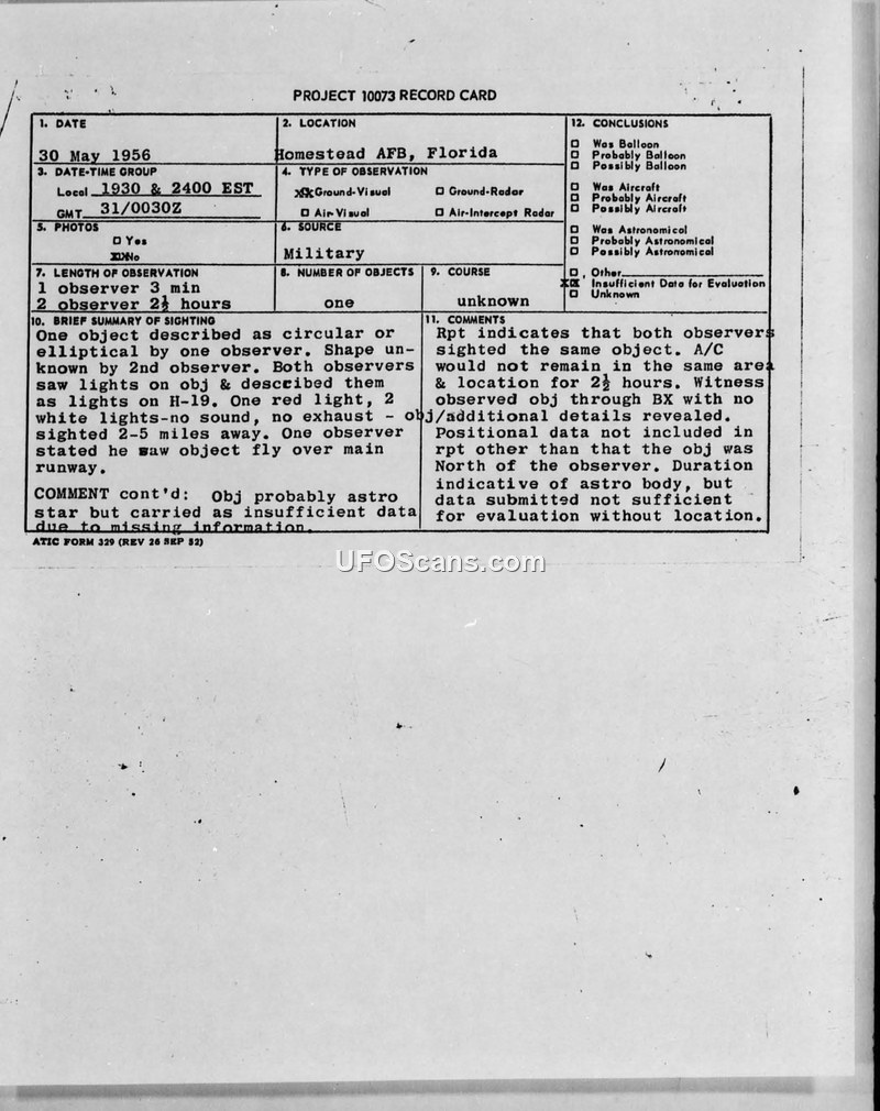 Project 10073 Record Card — Homestead AFB, Florida, 30 May 1956
