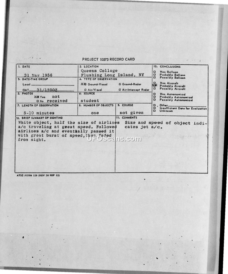 Project 10073 Record Card — Queens College, Flushing Long Island, NY, 31 May 1956