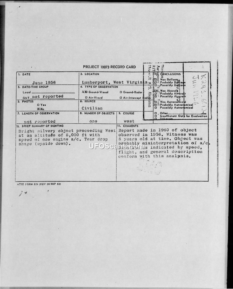 A 1960 report of a 1956 sighting in Lumberport, West Virginia, was investigated by the Air Force. The object was officially concluded to be a misidentified aircraft.