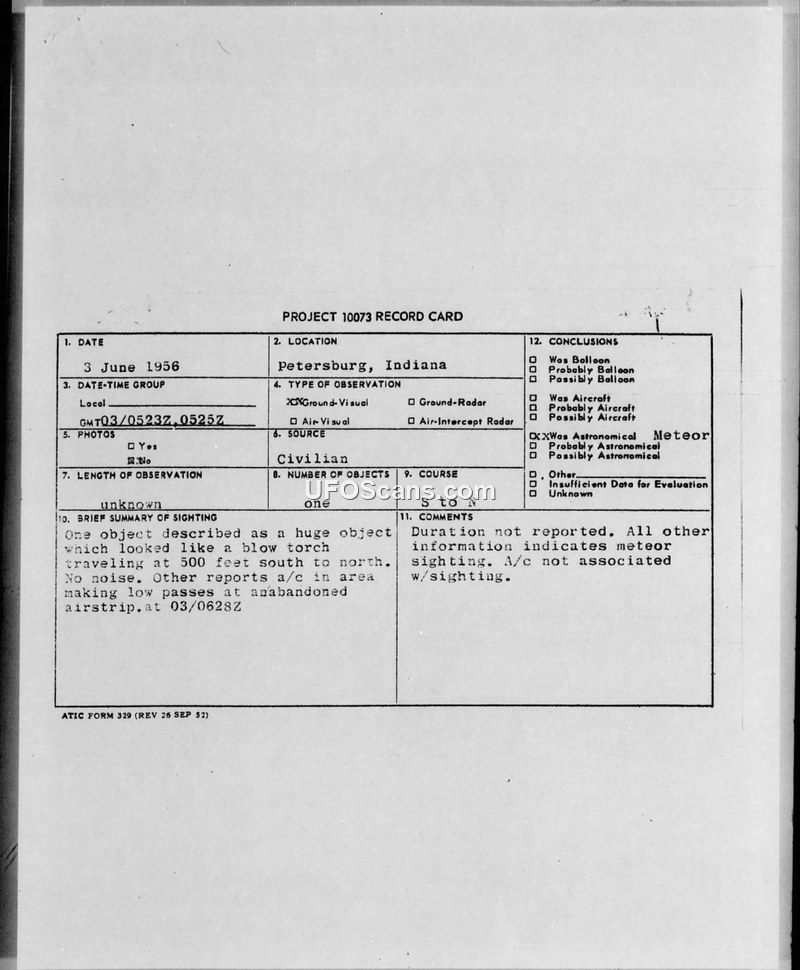 PROJECT 10073 RECORD CARD — Petersburg, Indiana, 3 June 1956