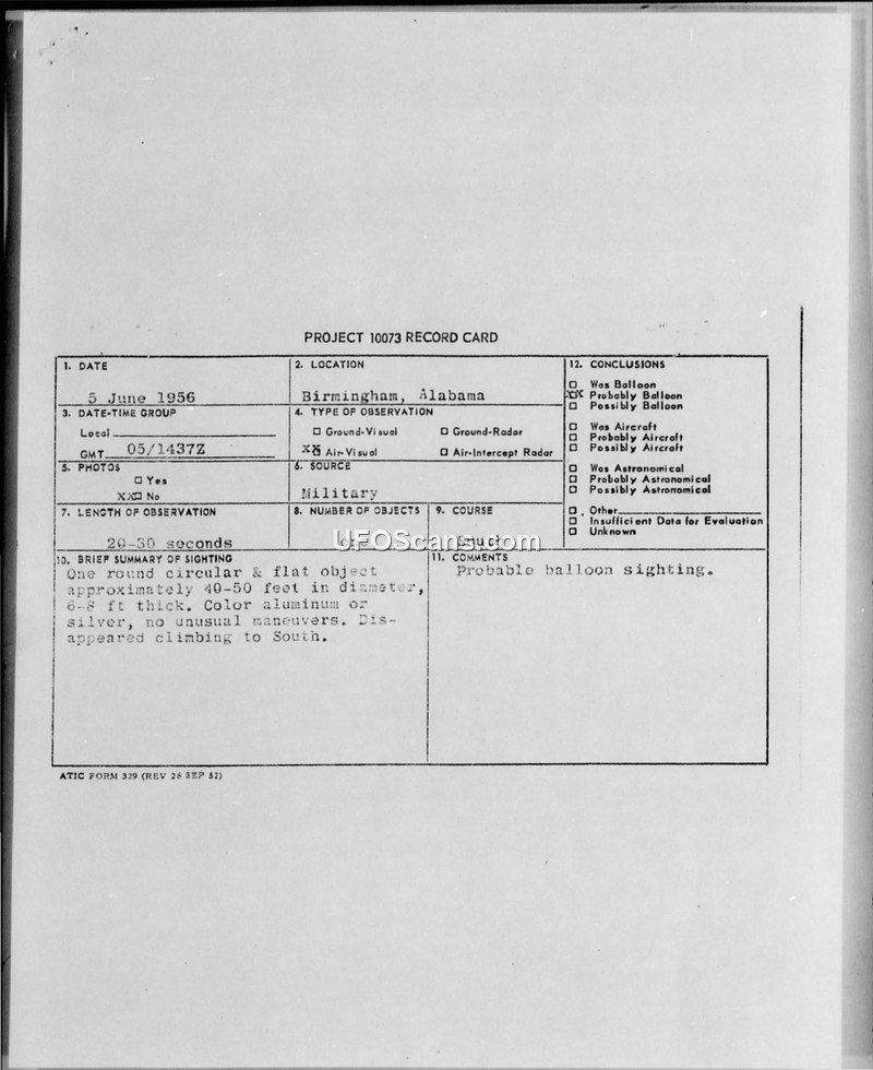 Sighting of Unidentified Flying Object over Birmingham, Alabama, 5 June 1956