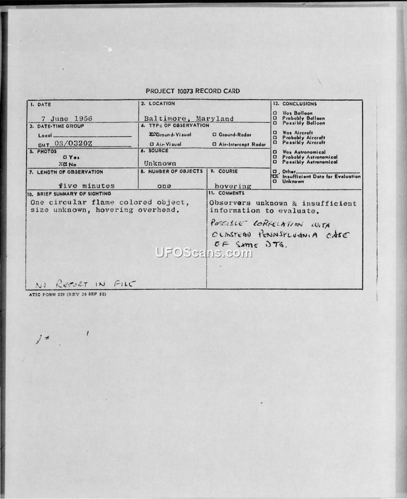 Air Intelligence Information Report: UFOB Sighting, Baltimore, Maryland, 15 June 1956