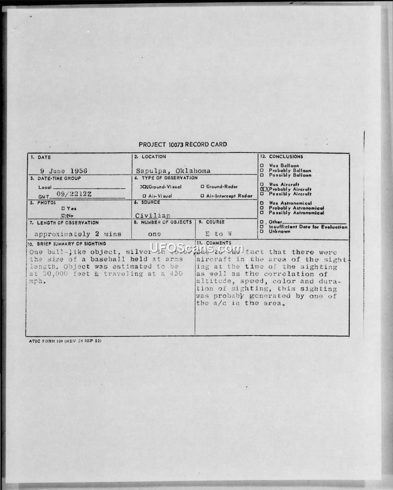 A sighting of a silver, ball-like object near Sapulpa, Oklahoma, on June 9, 1956, was investigated by the Air Force. The incident was officially attributed to aircraft activity in the area.