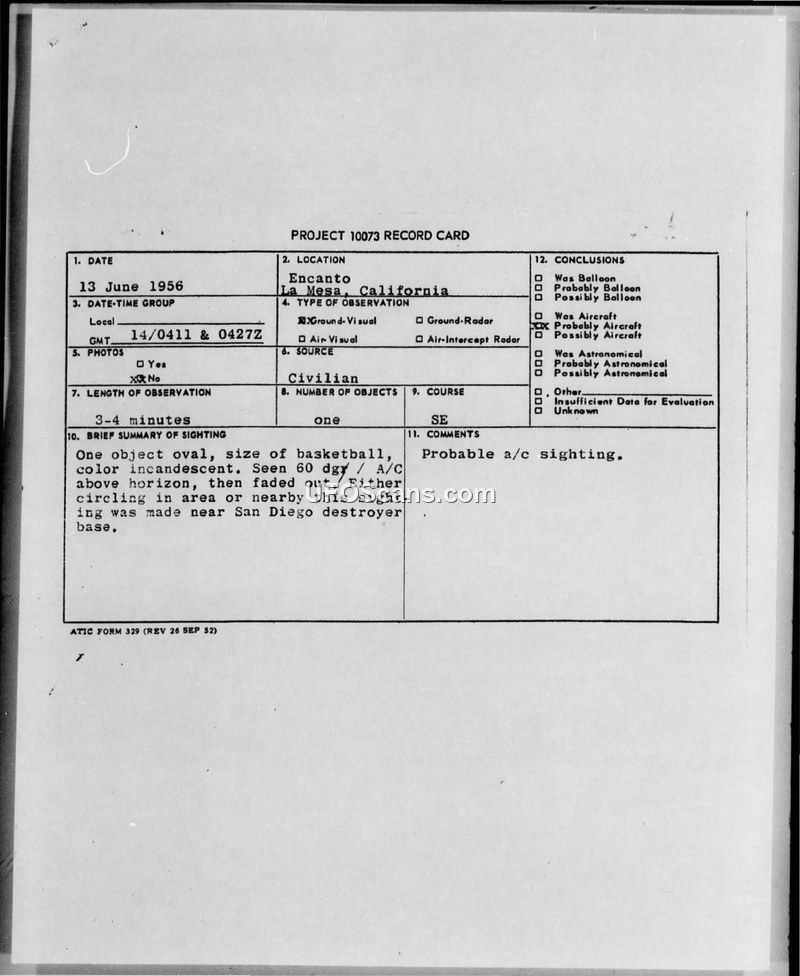 Project 10073 Record Card — La Mesa, California, 13 June 1956