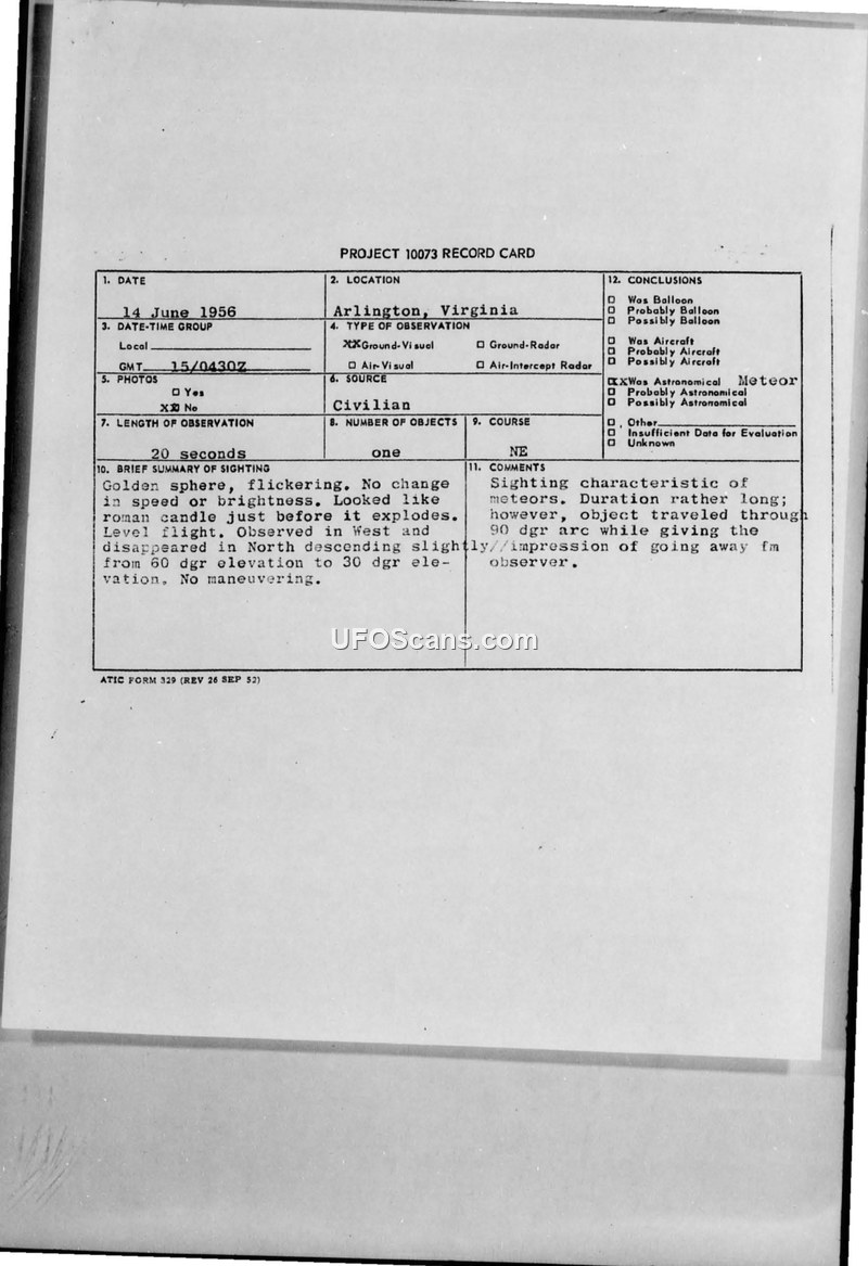 Project 10073 Record Card — Arlington, Virginia, 14 June 1956