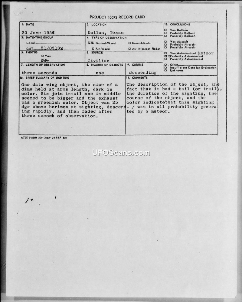 Two UFO sighting reports from Dallas, Texas, in June 1956, both officially attributed to meteors by the Air Technical Intelligence Center.