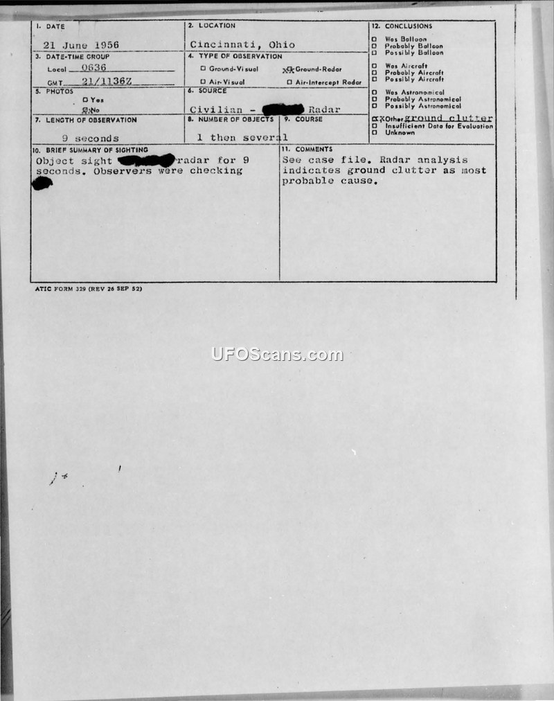 A radar sighting in Cincinnati on June 21, 1956, was initially reported as an unidentified phenomenon but was officially concluded by the Air Technical Intelligence Center to be ground clutter caused by atmospheric refraction.