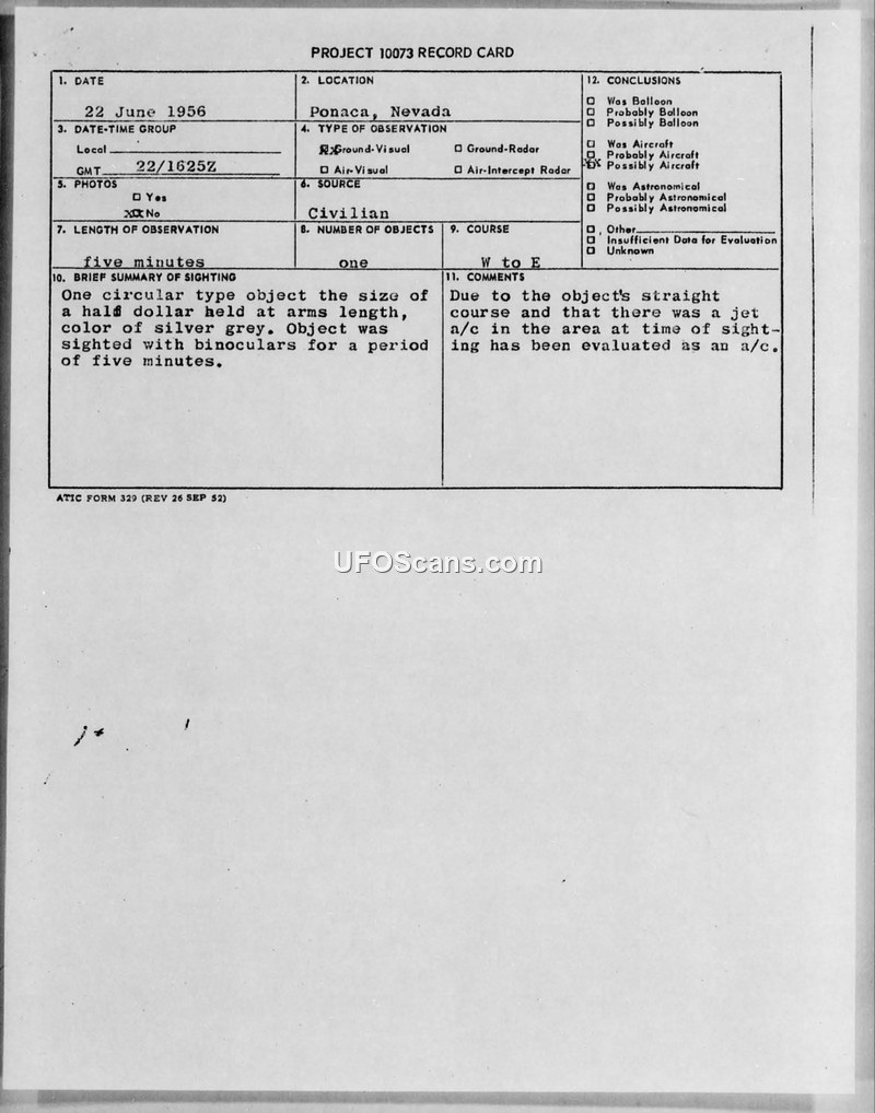 A 1956 sighting of a circular object in Ponaca, Nevada, was officially evaluated as an aircraft due to a straight flight path and the presence of a jet in the area. The report includes a Project 10073 record card and military teletype correspondence.