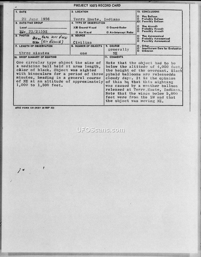 A civilian in Terre Haute, Indiana, reported a black, circular object on June 22, 1956. The military investigation concluded the object was a weather balloon.