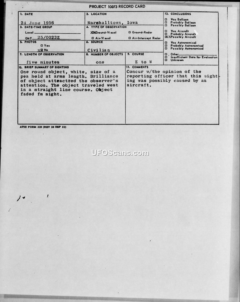 A civilian in Marshalltown, Iowa, reported a bright, round, white object moving west on June 24, 1956. Military investigators concluded the object was likely a conventional aircraft.