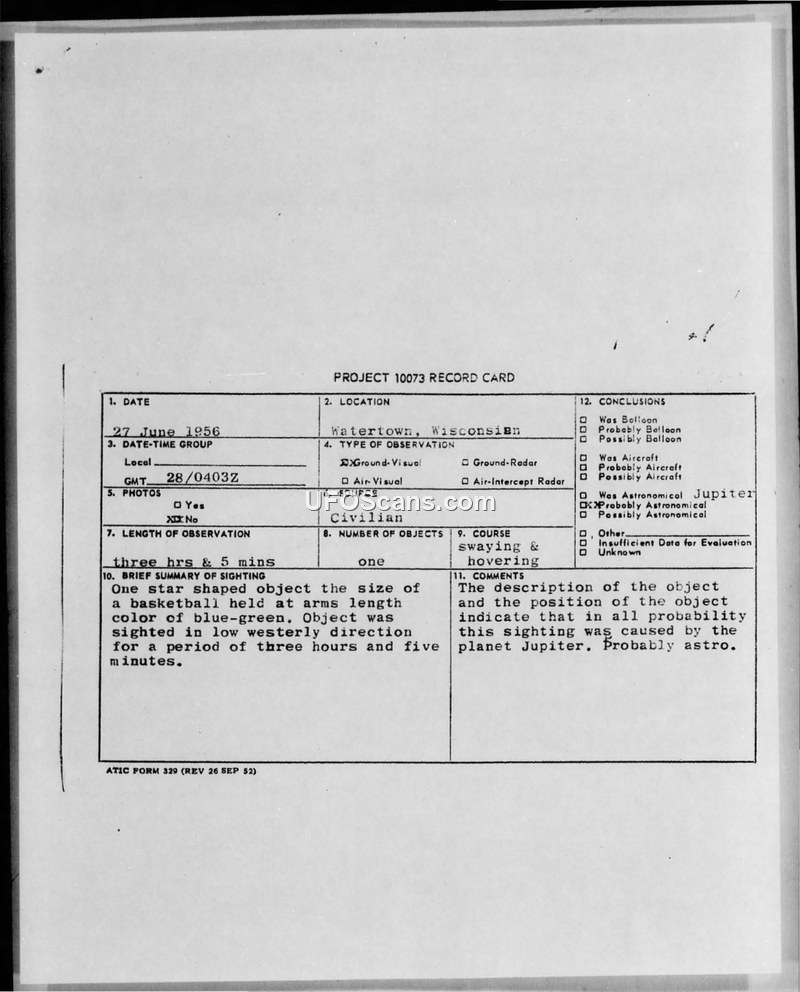 A civilian in Watertown, Wisconsin, reported a hovering, blue-green, star-shaped object on June 27, 1956. The Air Technical Intelligence Center concluded the object was likely the planet Jupiter.