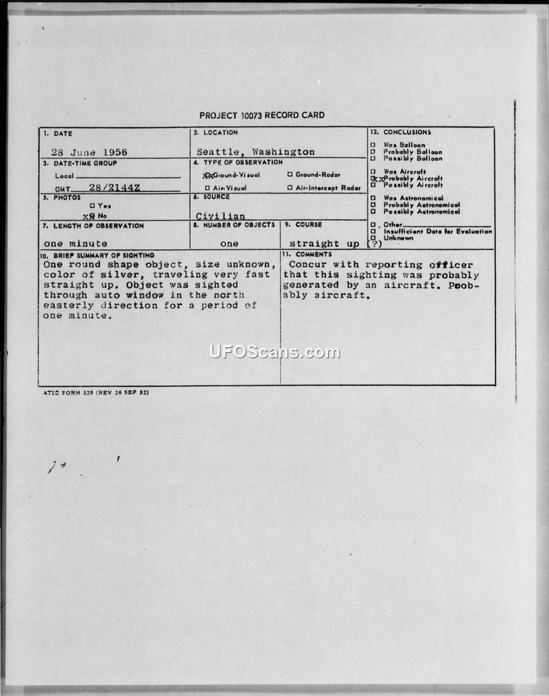 Project 10073 Record Card — Seattle, Washington, 28 June 1956