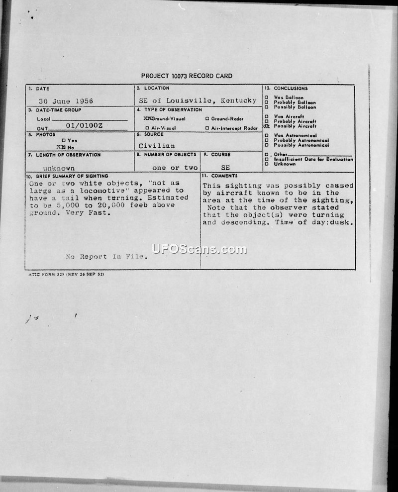 This document contains a collection of records related to Unidentified Aerial Phenomena (UAP) sightings, primarily centered around Project 10073. The primary record is a Project 10073 Record Card detailing a sighting on June 30, 1956, near Louisville, Kentucky. An observer reported one or two white objects, described as smaller than a locomotive, which appeared to have a tail while turning and descending at high speed. The official conclusion for this incident was that it was possibly caused by aircraft known to be in the area at the time. The document also includes extensive correspondence and reports regarding an alleged contact case in Brazil involving Professor Joao Freitas Guimaraes. Guimaraes claimed to have been contacted by beings from another world on a beach in Sao Sebastiao in June 1956. The editor of the publication 'The Flying Saucer' (CPDV) expresses significant skepticism regarding Guimaraes' claims, labeling them a hoax and a hallucination, and noting that Guimaraes' story evolved over time. The document further details the involvement of other witnesses, such as Jorge Pereira, who claimed to have seen a saucer on August 12, 1957, in an attempt to verify Guimaraes' story. The editor highlights the tendency of newspapers to ignore 'common sightings' due to their monotonous nature, while noting that contact claims receive significant attention. Additionally, the document contains brief summaries of other cases, including a June 17, 1956, sighting in Cincinnati, Ohio, and a June 29-30, 1956, sighting in Yonkers, New York, where observers reported seeing glowing, colored objects. The document concludes with a list of sightings from July 1956, categorized by location, observer, and evaluation, showing a mix of explanations ranging from birds and balloons to aircraft and astronomical phenomena.