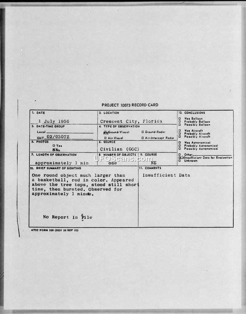 This document is a Project 10073 record card detailing a UFO sighting that occurred on July 1, 1956, in Crescent City, Florida. The report, sourced from a civilian via the Ground Observer Corps (GOC), describes a single, round object that was observed for approximately one minute. The witness reported that the object was significantly larger than a basketball and red in color. According to the brief summary provided, the object appeared above the tree tops, remained stationary for a short period, and then burst. The record indicates that the observation was visual in nature, with no radar contact or photographic evidence obtained. The official conclusion reached by the evaluating body was that there was insufficient data to perform a proper evaluation of the incident. The document notes that there was no further report on file regarding this specific event.