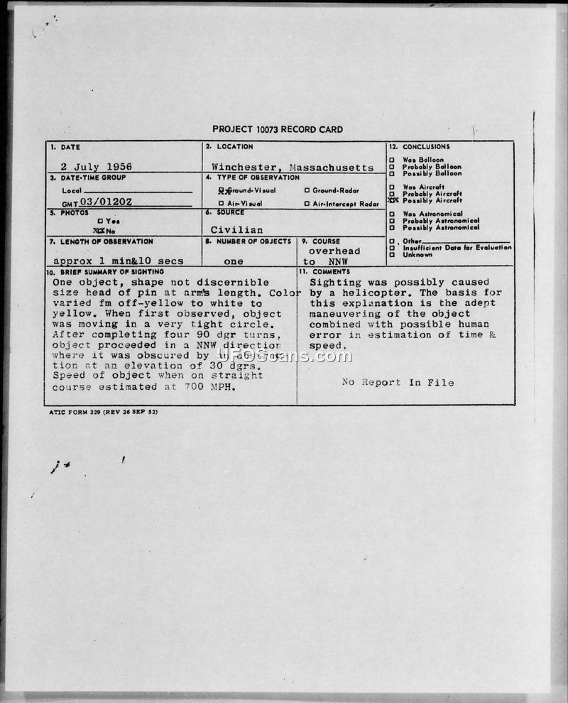 PROJECT 10073 RECORD CARD — Winchester, Massachusetts, 2 July 1956