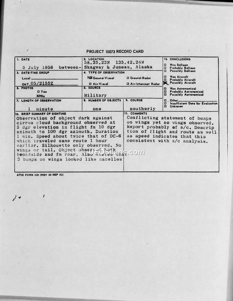 This document contains a Project 10073 Record Card and subsequent internal military correspondence regarding an unidentified aerial phenomenon reported on 5 July 1956 near Skagway and Juneau, Alaska. The sighting, which lasted approximately one minute, involved a single object observed by personnel at a CAA control station. The witness described the object as a dark, oblong silhouette against a cirrus cloud background, moving at a speed estimated to be twice that of a DC-6 aircraft. The report contains conflicting details, noting both that the object had no visible wings or tail, yet also describing three bumps on the wings that resembled engine nacelles or jet pods. The object was observed from both the broadside and the rear. Weather conditions at the time included scattered clouds and light rain showers. Following the initial report from the 5004th Air Intelligence Service Squadron, the Air Defense Command requested further information, specifically inquiring if the object could have been a Soviet aircraft violating U.S. airspace. In response, the AFOIN-4F2 division stated that there was no information on file regarding Soviet air activity in that specific area and noted that a CIA report on general Soviet Arctic activities did not provide a match. The final assessment by the investigating officers suggested that the report was likely of an aircraft, noting that the flight path and speed were consistent with aircraft analysis, although the specific description did not identify it as any known aircraft type.