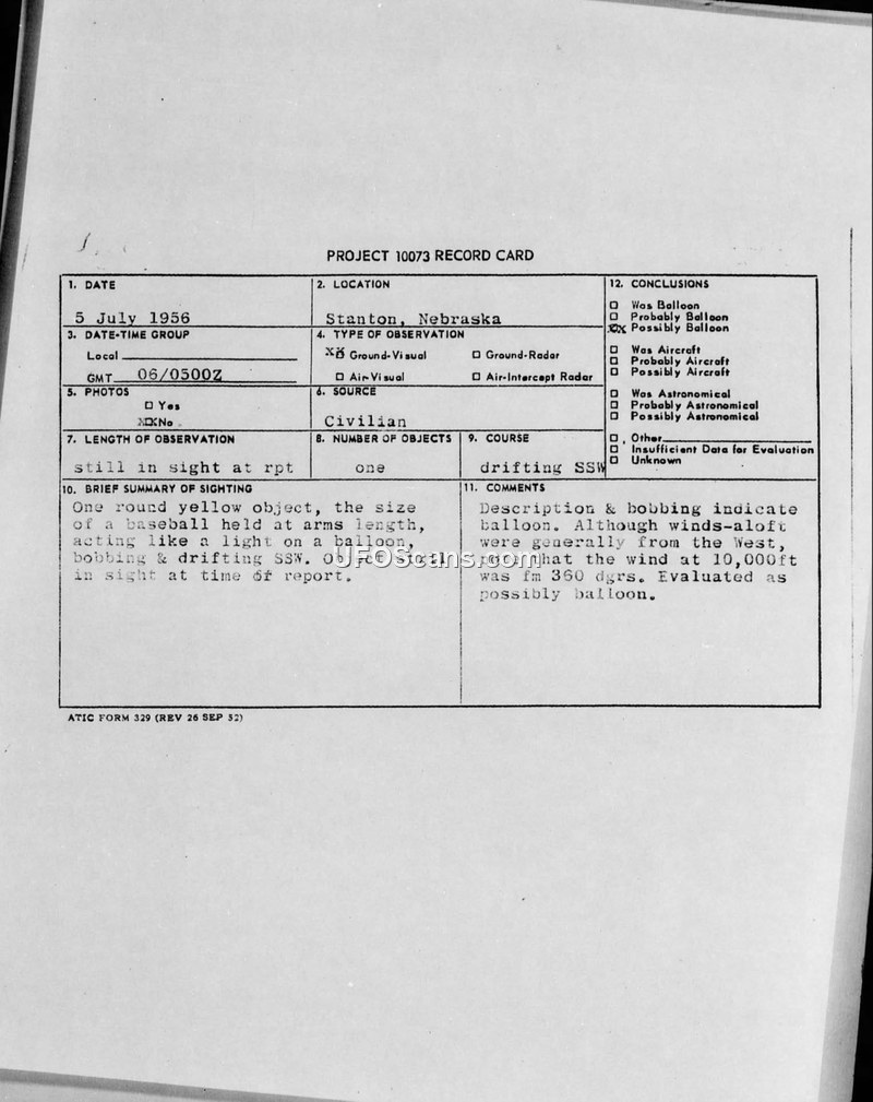 A civilian in Stanton, Nebraska, reported a round, yellow object on July 5, 1956. ATIC investigators concluded the object was likely a balloon based on its movement and local wind data.