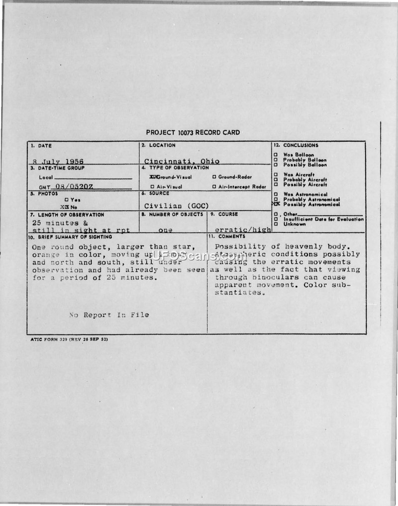 PROJECT 10073 RECORD CARD — Cincinnati, Ohio, 8 July 1956
