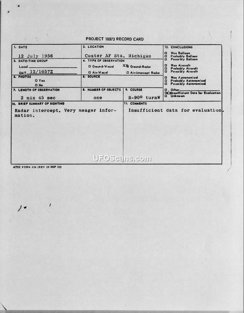 Project 10073 Record Card — Custer AF Station, Michigan, 12 July 1956