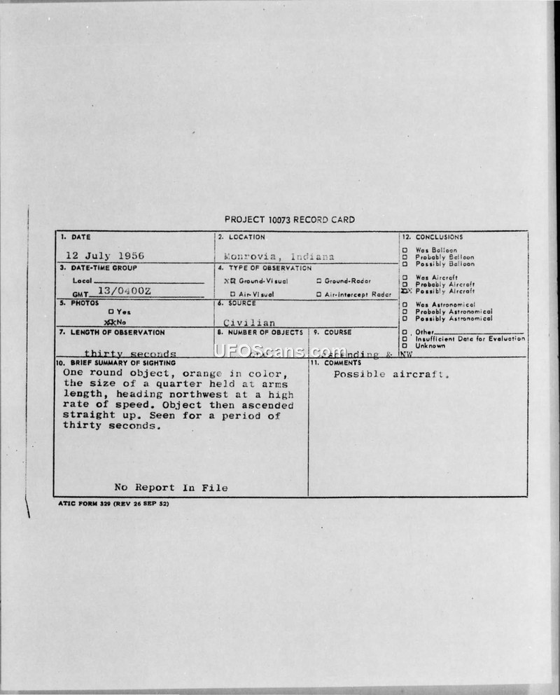 This document is a Project 10073 Record Card detailing a sighting that occurred on July 12, 1956, in Monrovia, Indiana. The observation, which lasted for thirty seconds, involved a single round object described as orange in color. The witness estimated the size of the object to be equivalent to a quarter held at arm's length. According to the report, the object was traveling northwest at a high rate of speed before it ascended straight up. The source of the report is identified as civilian. The record card indicates that no photographs were taken and there was no radar contact. The final conclusion noted on the card is that the object was a 'Possible aircraft.' The document also notes that there was 'No Report In File' regarding this incident.