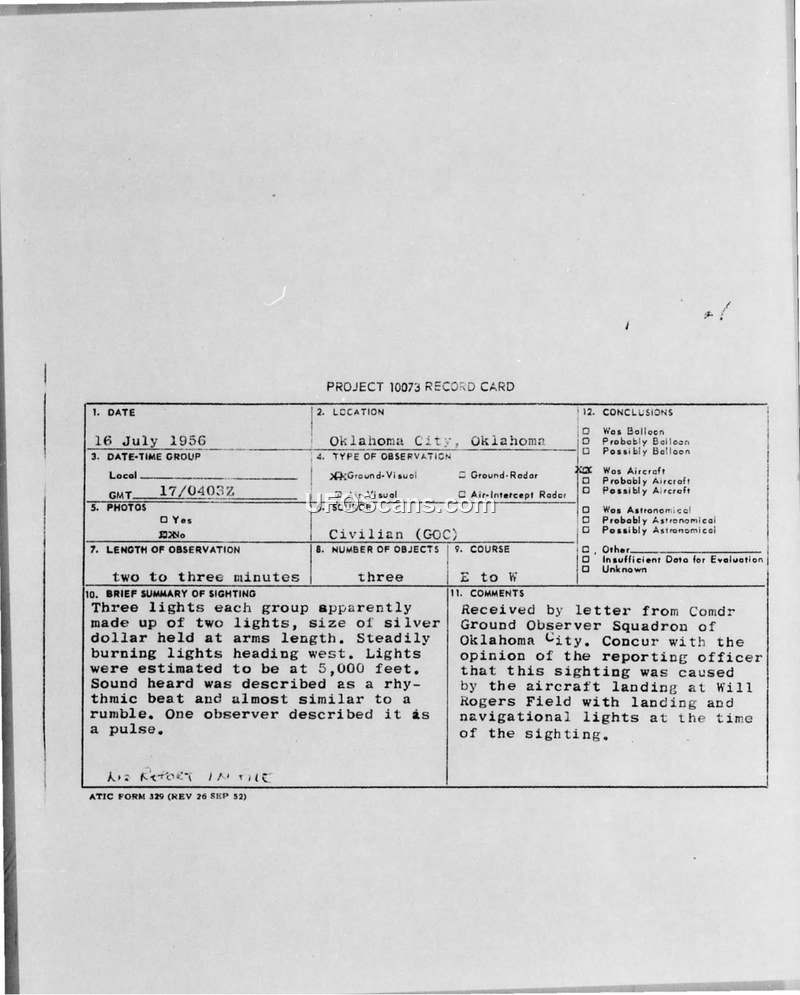 A 1956 Project 10073 record card detailing a sighting of three lights in Oklahoma City. The event was officially identified as an aircraft landing at Will Rogers Field.