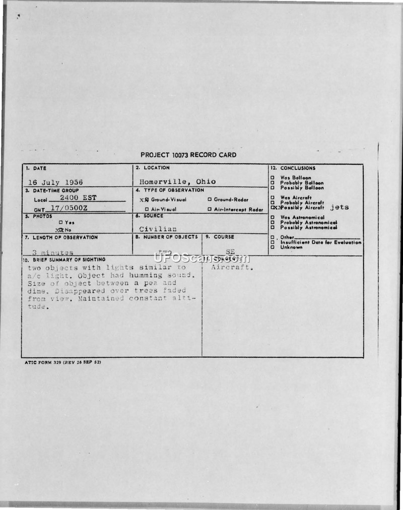 Project 10073 Record Card — Homerville, Ohio, 16 July 1956
