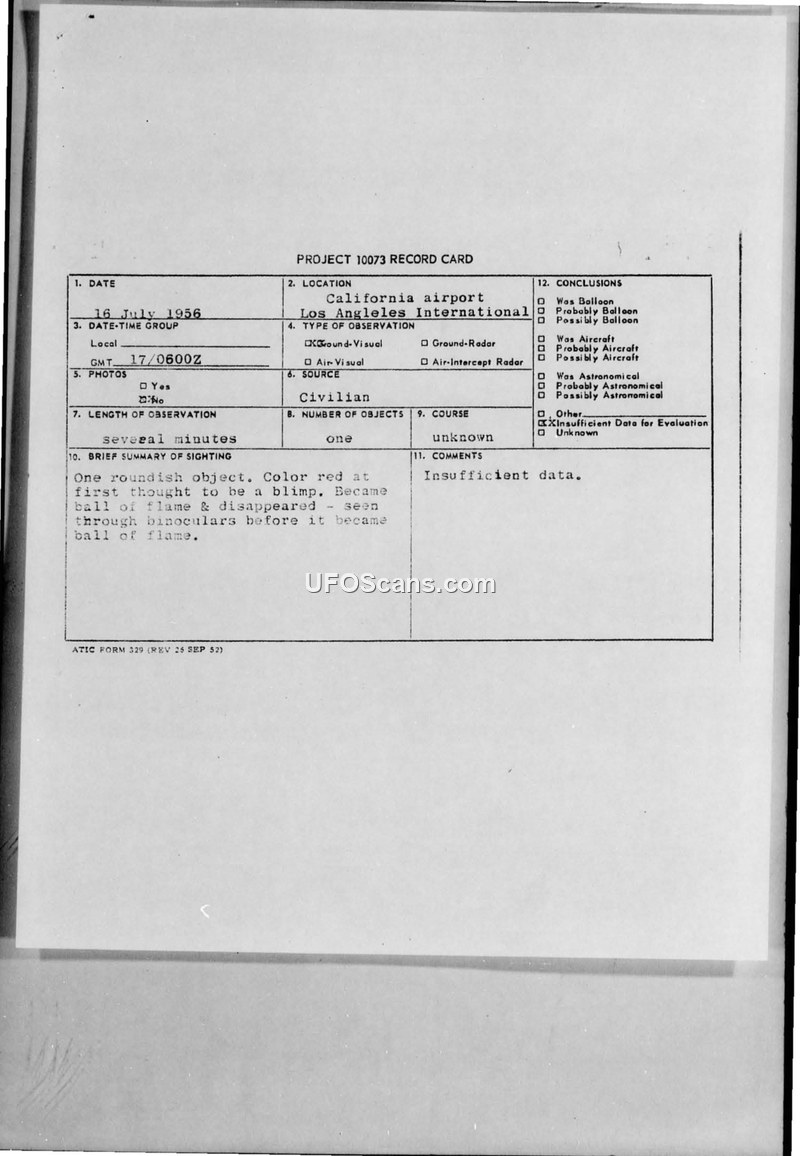 A Project 10073 record card documenting a 1956 sighting of a red, roundish object at Los Angeles International Airport. The object appeared to turn into a ball of flame before disappearing, but the case was closed due to insufficient data.
