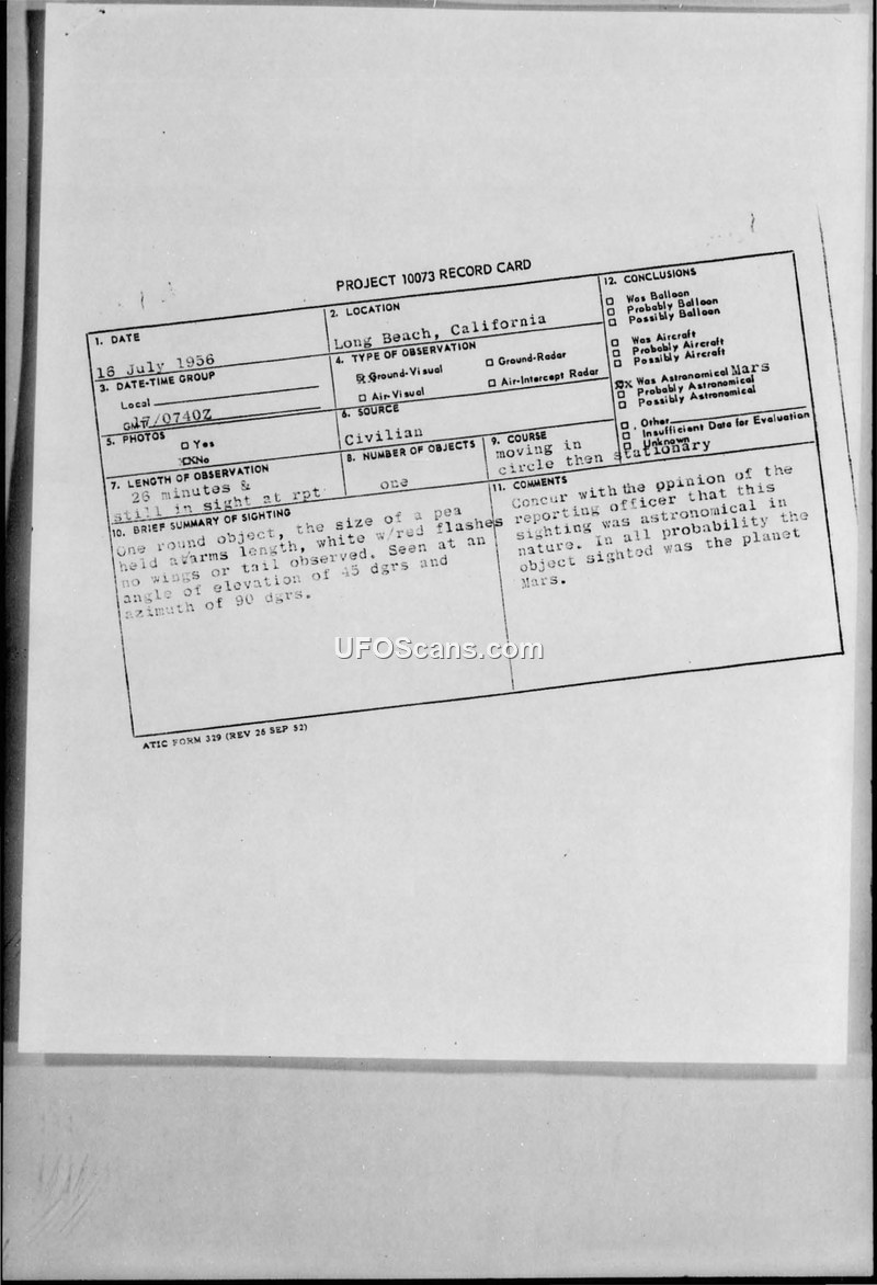 A civilian sighting of a stationary, round object in Long Beach, California, on July 16, 1956, was officially evaluated by the Air Technical Intelligence Center as the planet Mars.