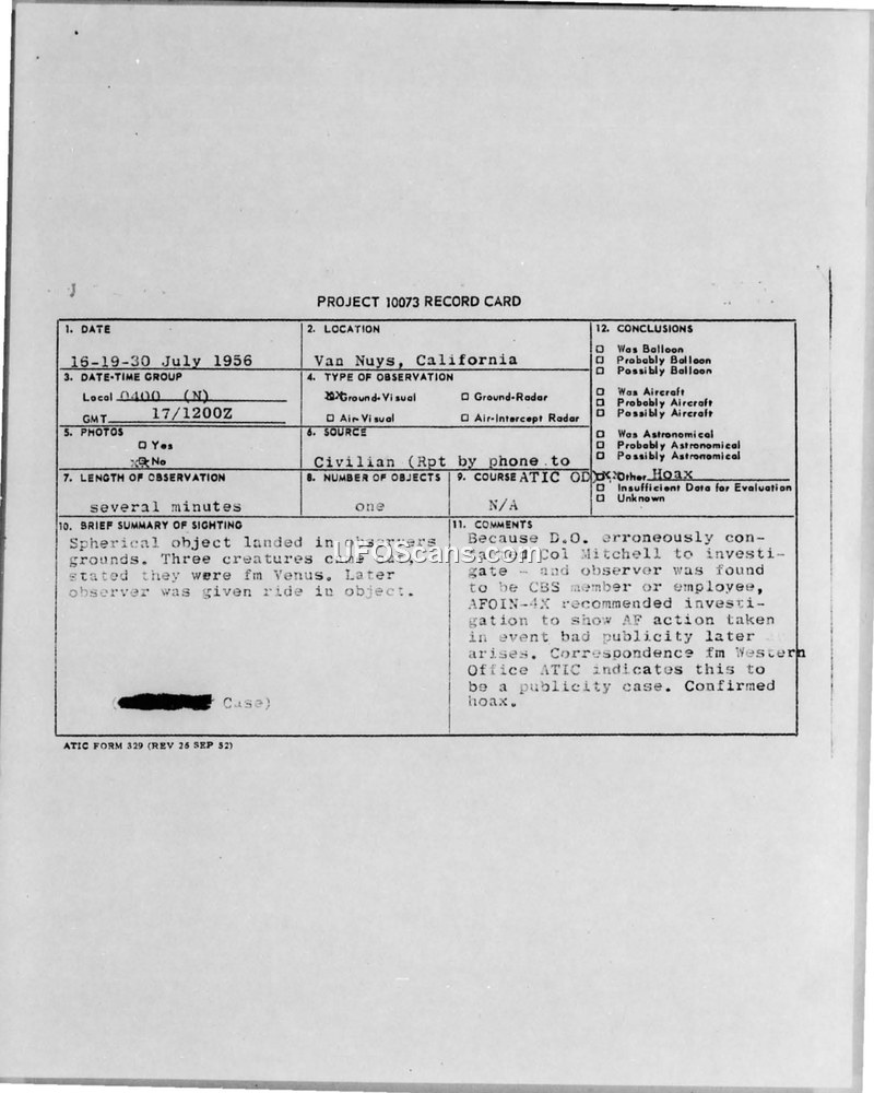 An Air Force investigation into a Van Nuys man's claims of contact with Venusian beings and travel aboard a spacecraft concluded the entire event was a pre-planned hoax. The witness, a CBS employee, sought publicity for his story, but physical evidence and witness interviews failed to support his claims.