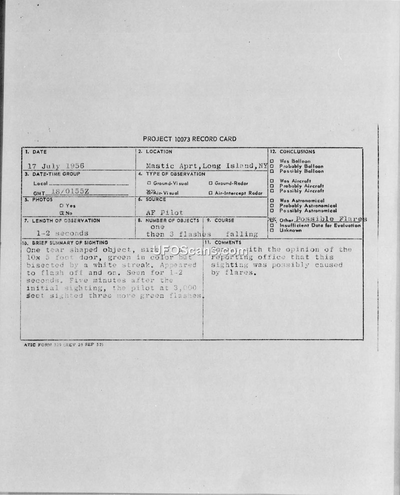 A 1956 sighting report of a green, tear-shaped object over Mastic Airport, Long Island. The event was officially attributed to flares.