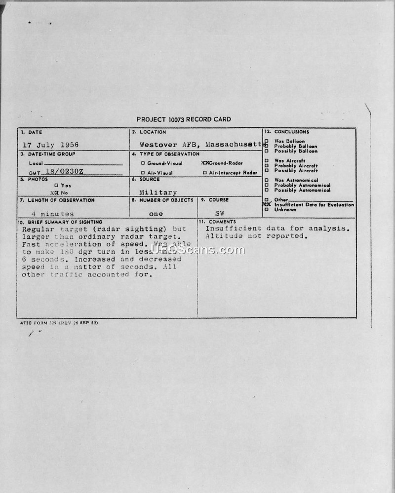 Project 10073 Record Card — Westover AFB, Massachusetts, 17 July 1956