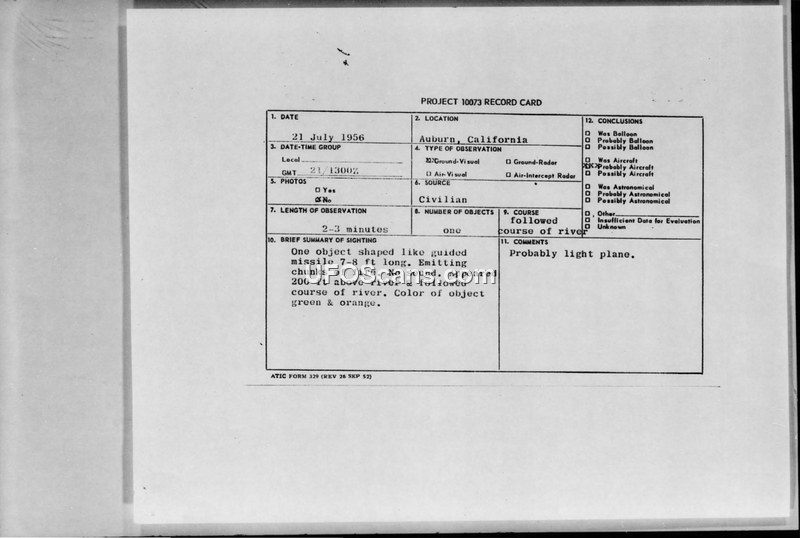A sighting of a missile-shaped object in Auburn, California, on July 21, 1956, was reported to the Air Force. The military concluded the object was likely a light plane.