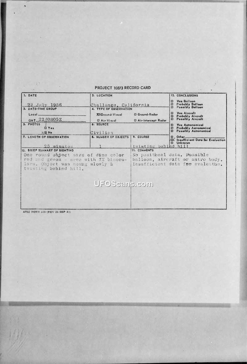A civilian in Challange, California, reported a 25-minute sighting of a slow-moving, red and green round object on July 22, 1956. The military investigation concluded there was insufficient data to identify the object.