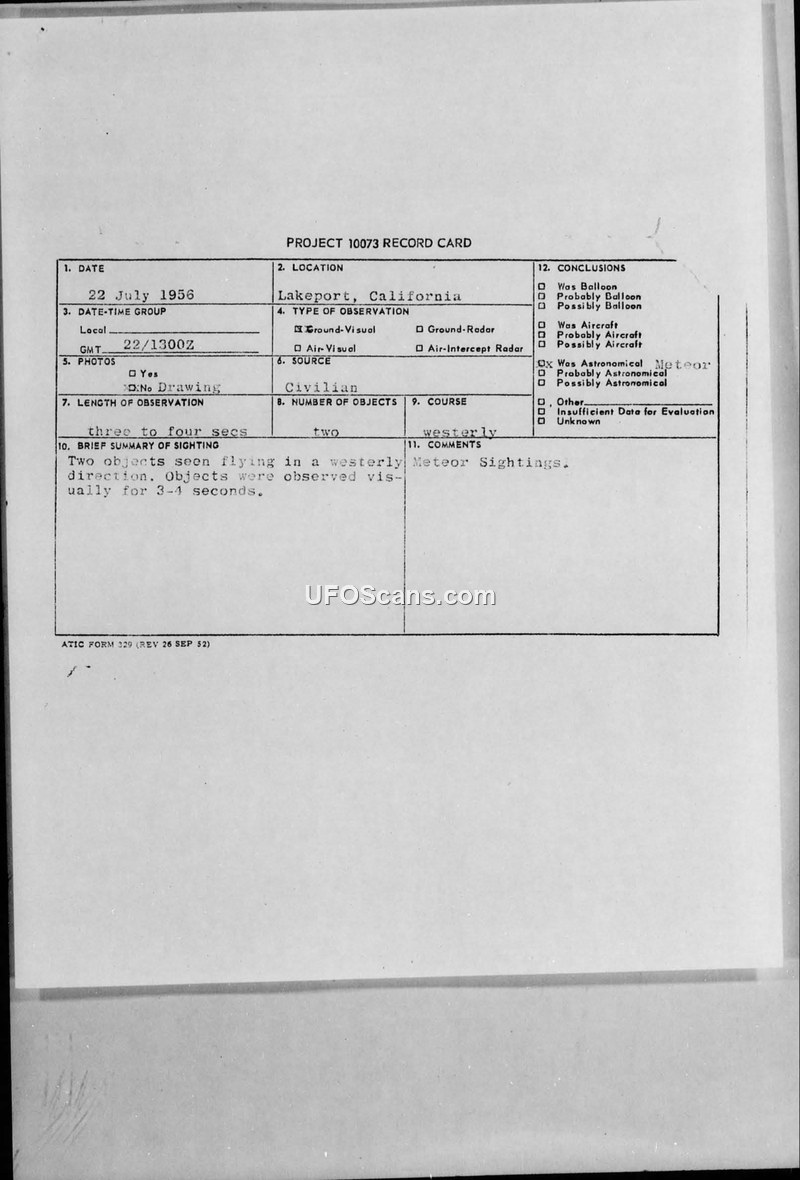 A Project 10073 record card documenting a July 1956 sighting of two objects in Lakeport, California, which was officially concluded to be a meteor.