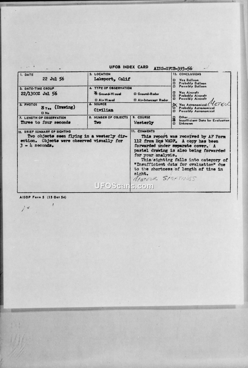 A 1956 UFO sighting report from Lakeport, California, involving two objects observed for three to four seconds. The case was closed as having insufficient data for evaluation.