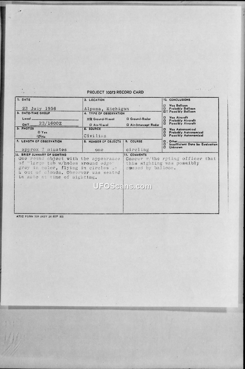 Project 10073 Record Card — Alpena, Michigan, 23 July 1956