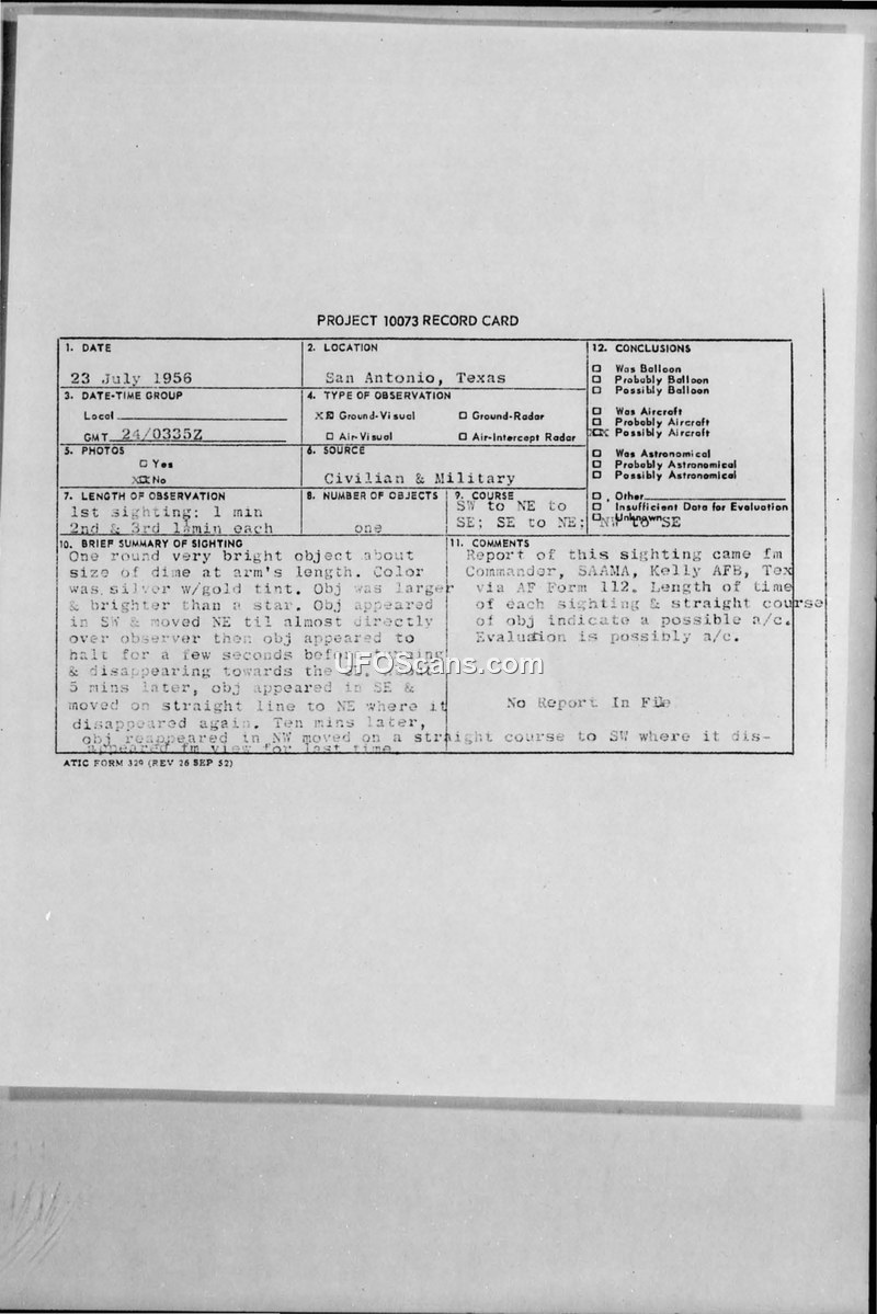PROJECT 10073 RECORD CARD — 23 July 1956, San Antonio, Texas