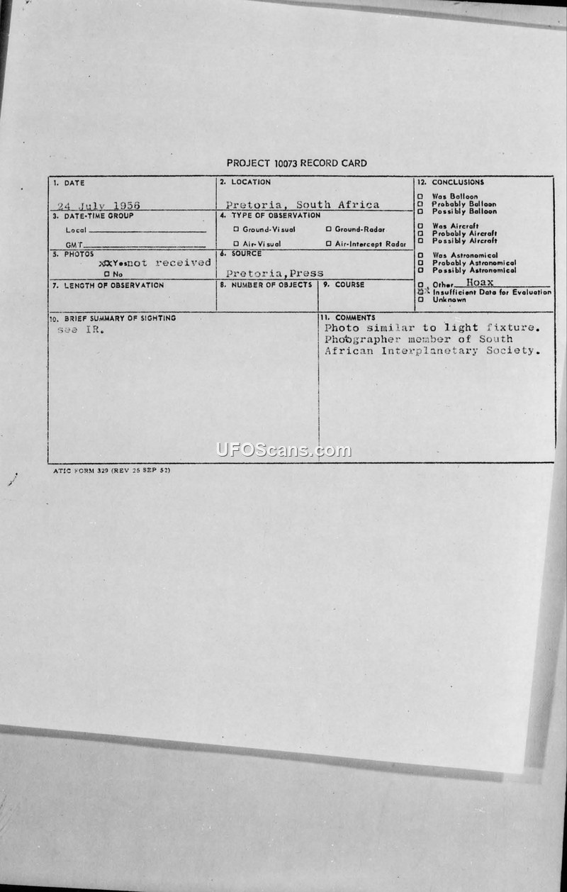 Project 10073 Record Card — Pretoria, South Africa, 24 July 1956