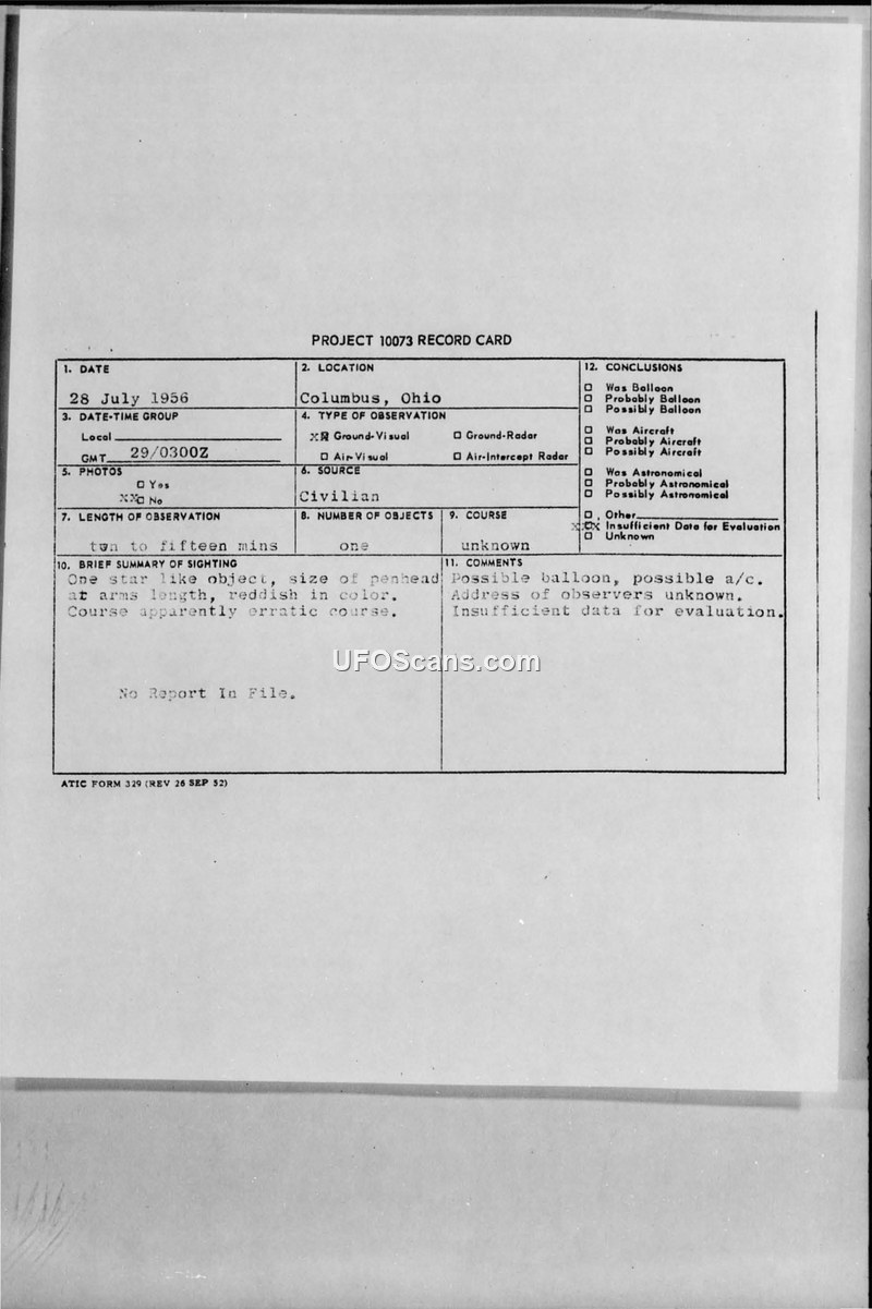 A Project 10073 record card detailing a 1956 civilian sighting of an erratic, reddish, star-like object in Columbus, Ohio. The case was closed as having insufficient data for evaluation.