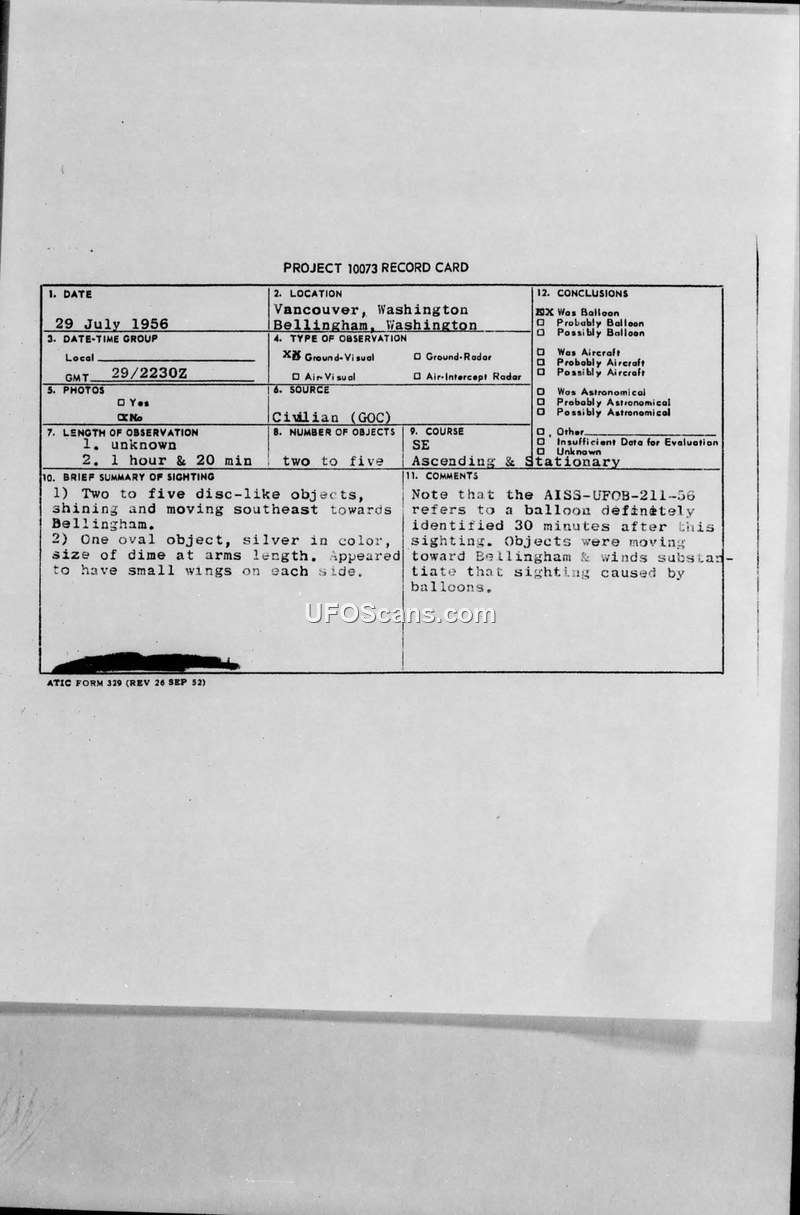 This Project 10073 record card documents a sighting reported by the Ground Observer Corps (GOC) on July 29, 1956. The observers reported seeing between two and five disc-like objects that were shining and moving in a southeast direction toward Bellingham, Washington. Additionally, one oval-shaped, silver object was described as appearing to be the size of a dime at arm's length, with small wings on each side. The duration of the observation was recorded as one hour and twenty minutes. The official conclusion reached by the evaluating authorities was that the objects were balloons. This determination was based on a cross-reference to report AISS-UFOB-211-56, which identified the objects as balloons thirty minutes after the initial sighting. The report further notes that wind conditions were consistent with the movement of balloons, thereby providing a conventional explanation for the reported phenomena.